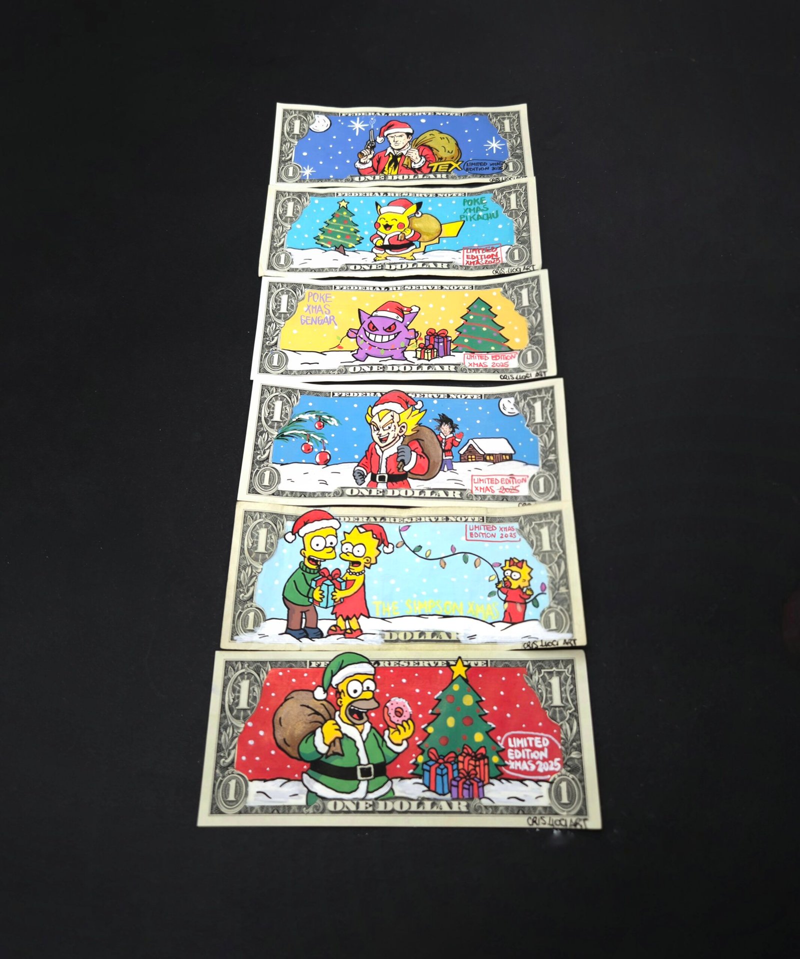 Serie natalizia “Limited Edition Xmas 2025”: dollari dipinti a mano in stile pop art con personaggi iconici, firmati Cris Lioci Art a soli 69,90€.
